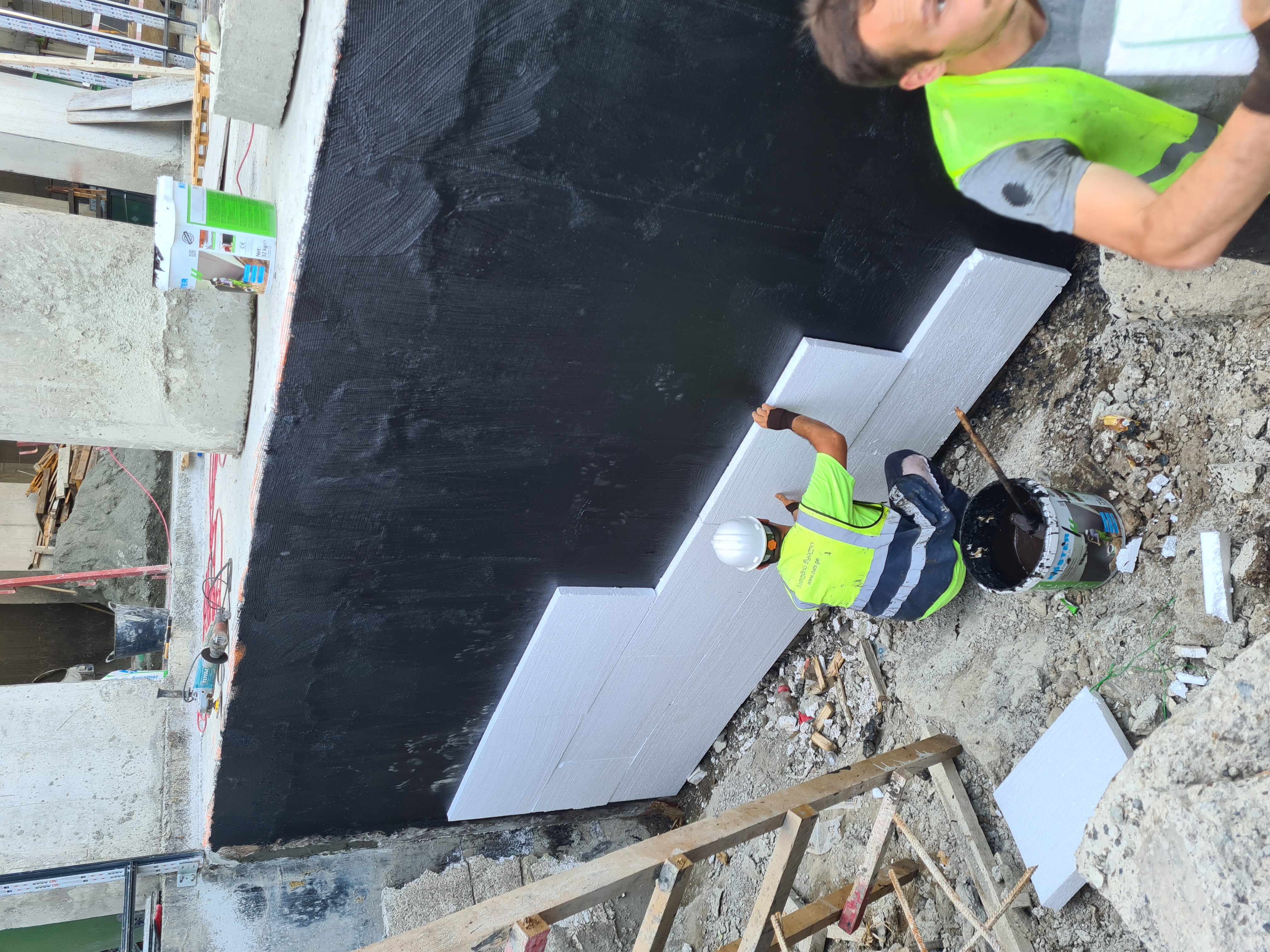 4.კედლების სრულად დამუშავება ორ კომპონენტიანი ბიტუმ-პოლიმერის ბაზაზე დამზადებული ჰიდროიზოლაციით